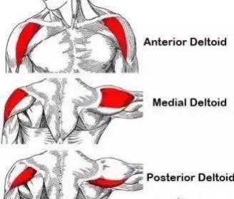 三角肌肩部肌肉除了斜方肌还有很重要的三角肌,由三块羽状肌组成:三角肌前束、中束、后束,这是不管男生还是女生都需要重点关注的。