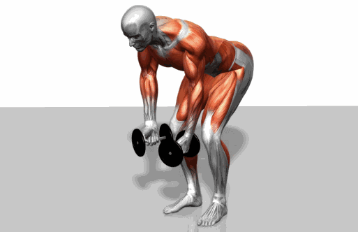 动作要领:俯身,向两侧提肘张肩和举臂挥腕,抬起哑铃同时挤压肩胛骨,使得上臂和躯干接近90°,高处稍作停留,然后下落还原。注意肩膀后收,令脊背肌群极度收缩。