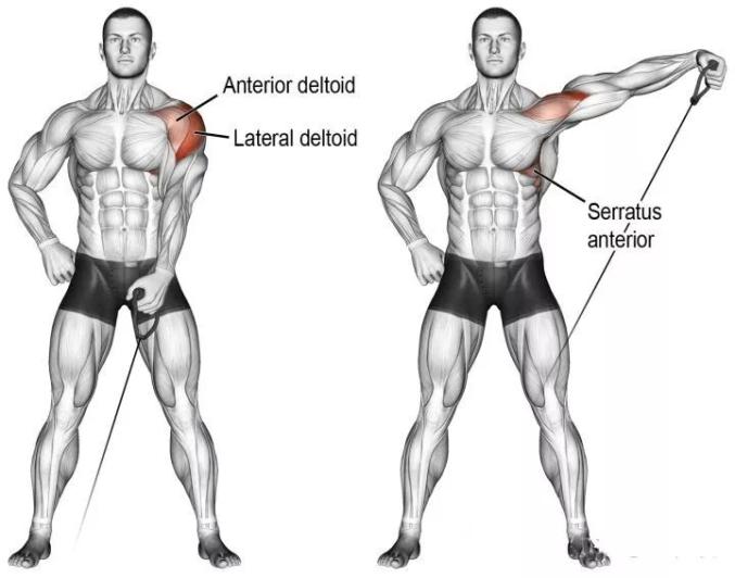 拉力器侧平举动作要领:选取适中的重量,稳定核心,单手手握拉力器绳索,通过肩部力量将拉起器向外展开。注意感知整个过程三角肌中束的肌肉发力。
