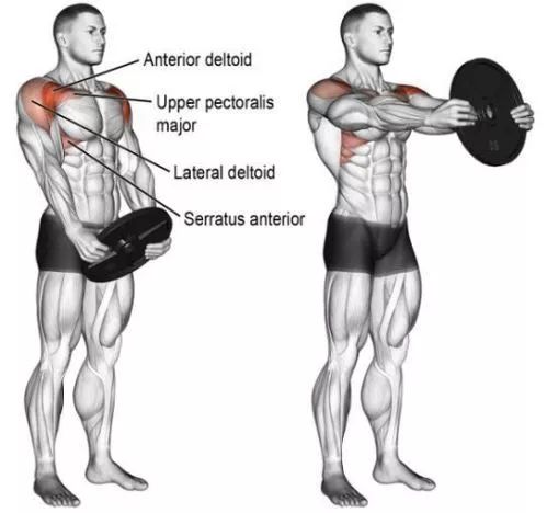 站姿杠铃片前平举动作要领:站立,两手正握杠铃片,肘部稍屈,向上举起至视线平行高度,还原。注意收紧核心稳定身体,上举不易过高,否者会让斜方肌过多参与。