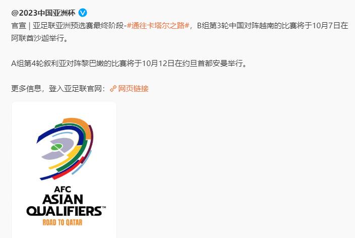 亚足联:国足越南比赛将在阿联酋开踢9月6日,亚足联更新世预赛亚洲区12强赛信息,B组第3轮中国对阵越南的比赛,将于10月7日在阿联酋沙迦举行。
