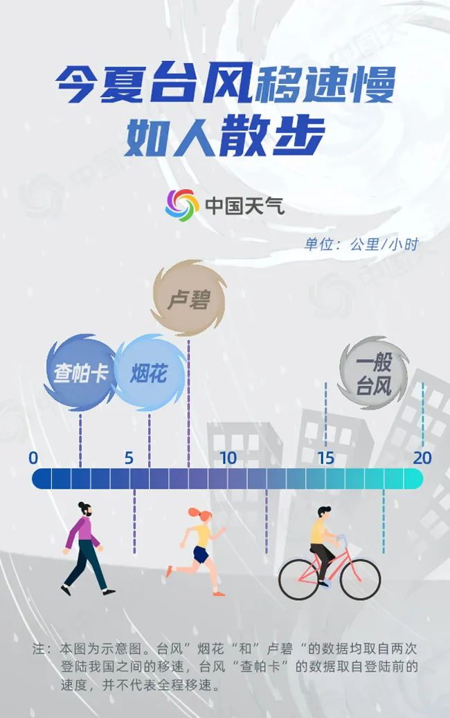 正是由于多个台风相互牵制,今年以来登陆我国的台风路径复杂、移速缓慢,相比普通台风15-20公里/小时的移动速度,今年以来登陆我国的这三个台风都属于台风界的“蜗牛”。
