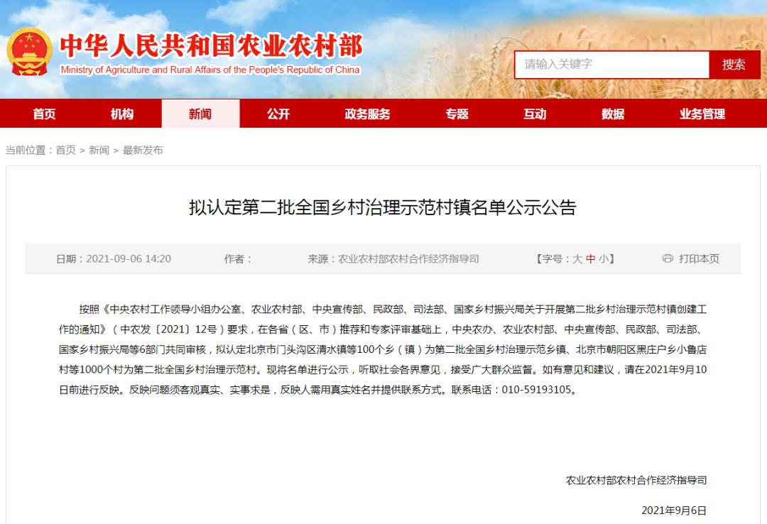 拟认定第二批全国乡村治理示范村镇名单公示公告按照《中央农村工作领导小组办公室、农业农村部、中央宣传部、民政部、司法部、国家乡村振兴局关于开展第二批乡村治理示范村镇创建工作的通知》(中农发〔2021〕12号)要求,在各省(区、市)推荐和专家评审基础上,中央农办、农业农村部、中央宣传部、民政部、司法部、国家乡村振兴局等6部门共同审核,拟认定北京市门头沟区清水镇等100个乡(镇)为第二批全国乡村治理示范乡镇、北京市朝阳区黑庄户乡小鲁店村等1000个村为第二批全国乡村治理示范村。现将名单进行公示,听取社会各界意见,接受广大群众监督。如有意见和建议,请在2021年9月10日前进行反映。反映问题须客观真实、实事求是,反映人需用真实姓名并提供联系方式。联系电话:010-59193105。
