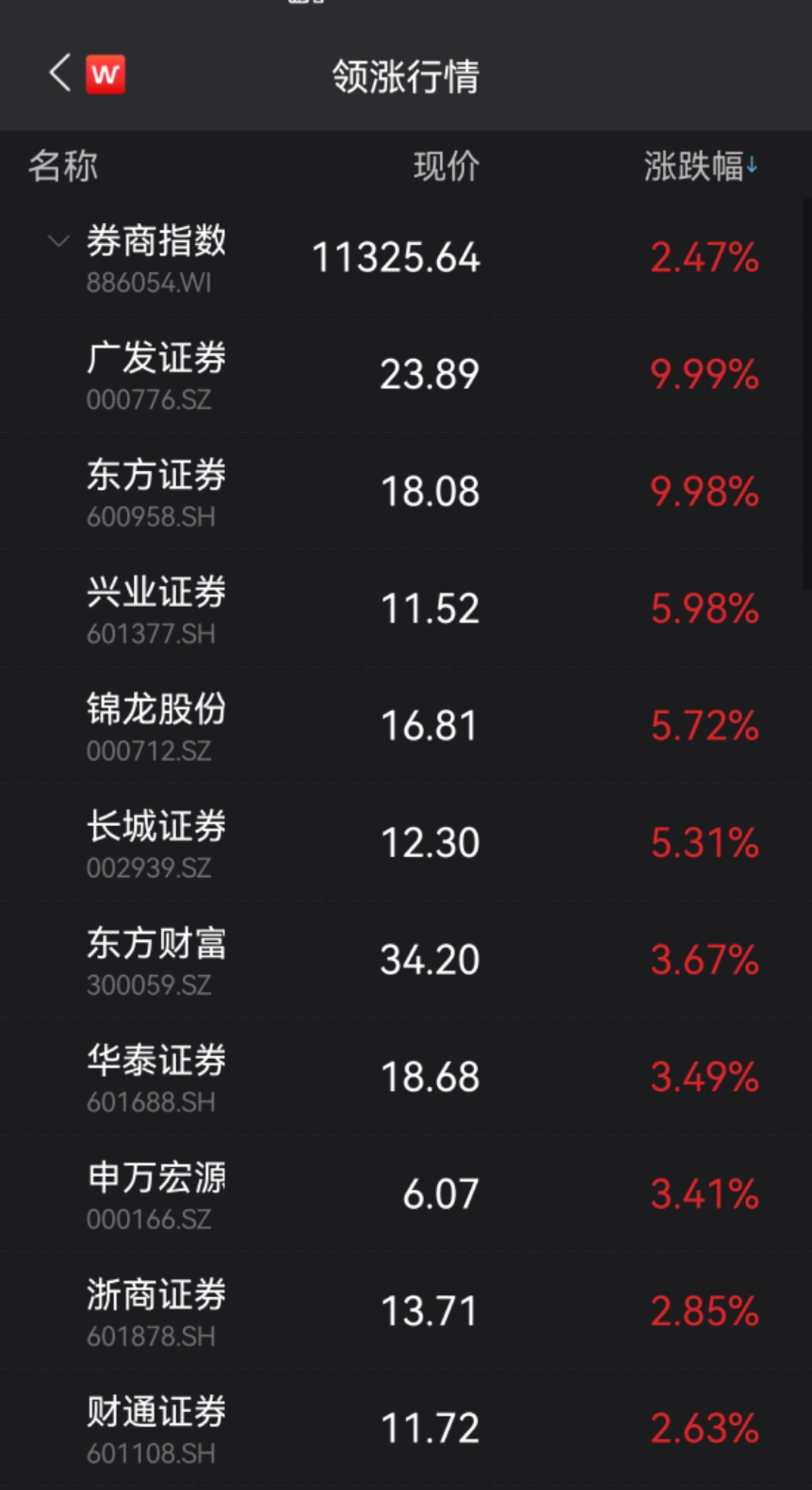 在一片红彤彤的数字中,广发证券、东方证券两只券商股强势涨停,兴业证券大涨近6%。