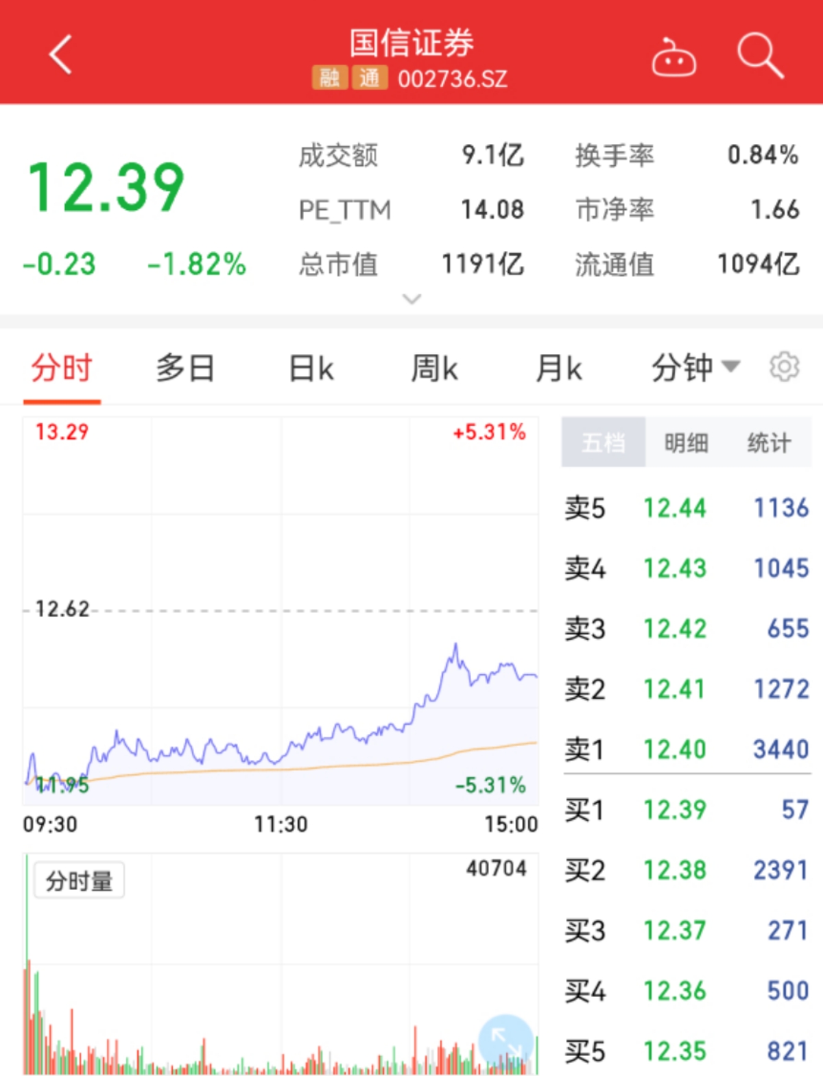 9月7日,Wind券商指数上涨2.47%,广发证券、东方证券两只券商股强势涨停。国信证券成为今日板块唯二下跌的券商股,股价下跌近2%,报收12.39元/股;年初至今股价下跌逾7%。