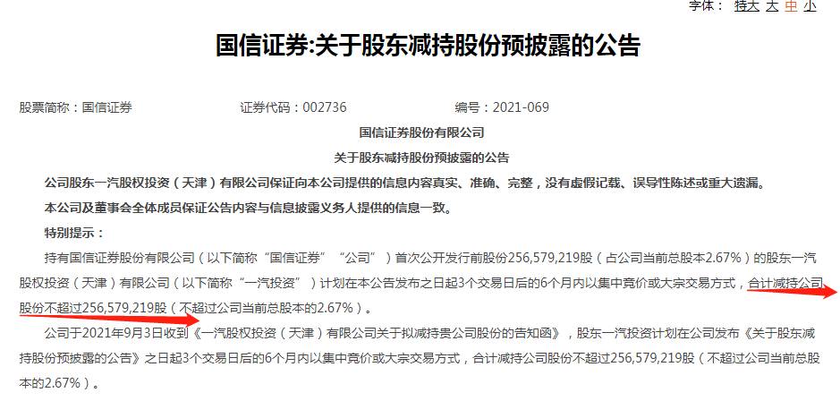 9月6日,国信证券发布公告称,股东一汽股权投资(天津)有限公司(以下简称“一汽投资”)计划在本公告发布之日起3个交易日后的6个月内以集中竞价或大宗交易方式,合计减持国信证券股份不超过2.57亿股(不超过公司当前总股本的2.67%)。