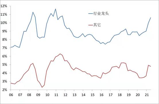 下图是前同事王晓东先生做的图,先算出每个行业中的行业龙头(大行业通常有很多个公司)相对本行业的超额收益,再算出所有行业龙头相对于所有行业的其他公司的平均超额收益水平。具有标志性的一年是2017年,也就是A股市场在很长时间内,都是小市值股票跑赢市场,获得超额收益,但随着2017年进入到“新价值投资时代”,大市值股票开始获得超额正收益。下图所指的行业龙头为申万三级行业口径(220多个)、每个行业里市值显著前列的公司。