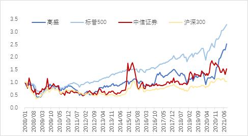 2008年至今高盛与中信的股价累计增幅