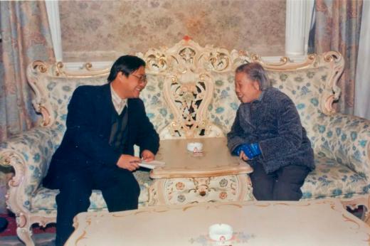 1997年12月16日,罗洪老人在红楼接受采访如今的“小红楼”,正门两旁各有一棵百余岁的罗汉松,遒劲的树干、繁茂的枝叶,犹如一位仙风道骨的老人。穿过客厅,可见一条长廊,右侧连接起客房,左侧是通往二楼的棕色木质楼梯,楼梯扶手经过岁月打磨,透出光亮的色泽。