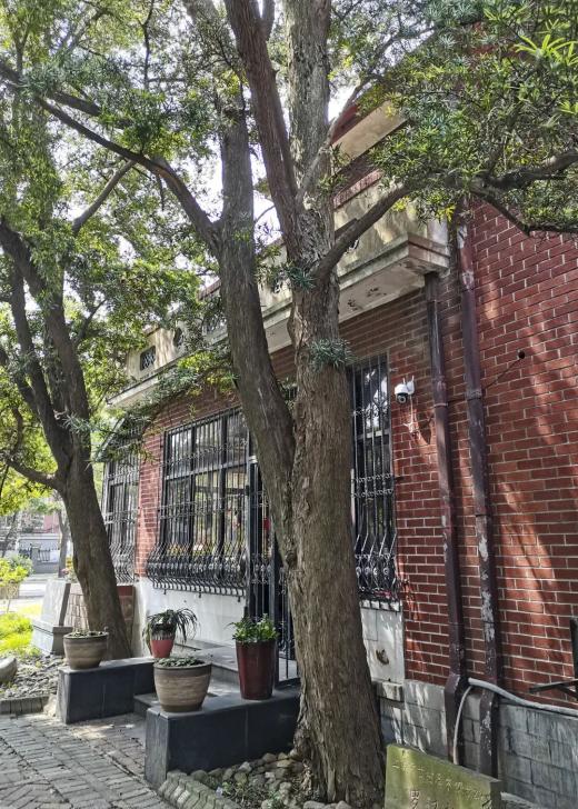 “小红楼”正门两旁各有一棵百余岁的罗汉松