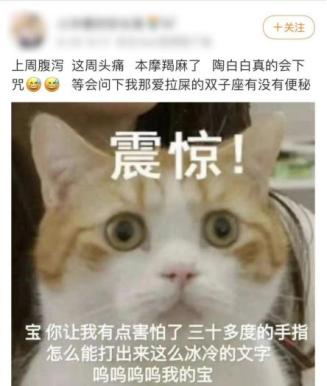 再是第二天水瓶座朋友发了一条“陶白白!明明是最后一天了可恶还是没躲过,拉肚子了”。