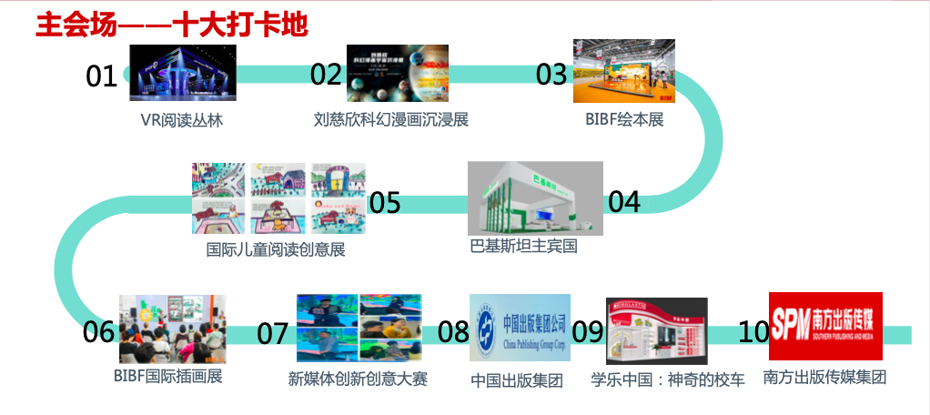 结合当下出版行业热点与书展各展区的特色,本届书展还特别推出“十大打卡地”,VR阅读丛林、刘慈欣沉浸展、国际儿童阅读创意展、主宾国巴基斯坦、BIBF绘本展、BIBF插画展等均在其列。