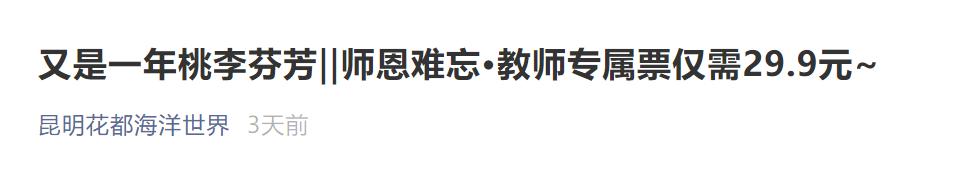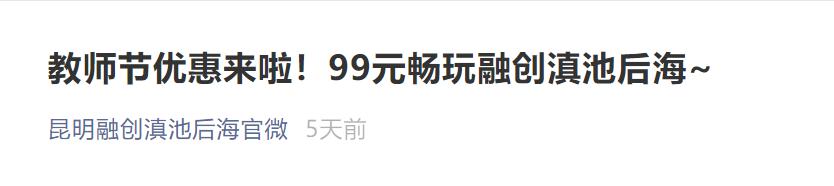 昆明融创滇池后海推出“99元教师节专属票”活动。9月10日至9月12日,教师凭教师资格证和身份证只需99元即可畅游原价238元的海世界。9月10日至9月16日,教师凭借教师资格证和身份证只需99元即可畅滑原价238元的雪世界3小时。此外,在“教师节雪世界优惠套餐”中,每名教师限购2张(第二张不限人群使用,使用时,持证购买人员必须陪同入园。)“99元教师节专属票(雪世界+海世界)”活动每位教师可免费携带一名1.1米以下儿童。