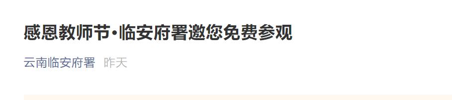 位于建水的临安府署,9月10日至9月12日,凭教师资格证到临安府署参观游览均可免票,且同行人给予门票半价优惠。