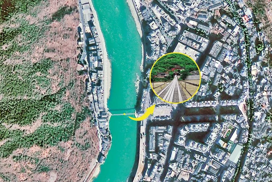 红色地标:泸定桥。 卫星影像由中国四维提供最后的村庄不“村庄”