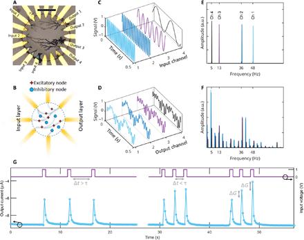 该研究用到的另一项技术,是有机电化学晶体管(Organic Electrochemical Transistor,OECT)。它能够以更小的能耗、对生物体更兼容的方式,对铁离子的局部浓度变化做出响应。该研究使用有机电化学晶体管构建储备池(图1A)。其中包含激发型和抑制型的节点(图1B),其输入是生物电信号(图1C),输出是储备池记录的状态(图1D),图E和F分别是输入和输出信号傅里叶变换的结果。图1G展示了储备池网络中的短期记忆,由于其存储和计算一体,故储备池网络能够以更低的能耗运行。