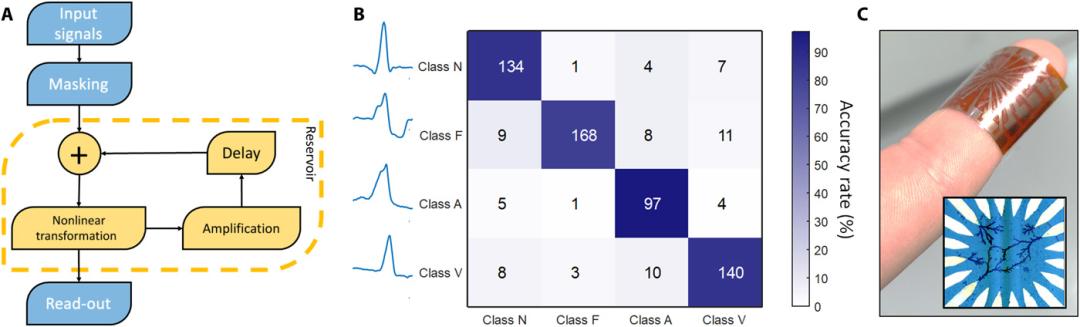 图1. 储备池网络的非线性转换具体的实物如图2C所示,是贴在手指上如创可贴一样的金属片,具有重量轻、非侵入式、低能耗(其能耗相当于心脏起搏器)等优势。其计算架构如图2A所示,为了对信号进行非线性变化,会在260微秒的延迟后,将增强后的信号输入,最后得出实时分类。该神经网络的非线性变化甚至可以放大医生无法觉察的心电信号变化。
