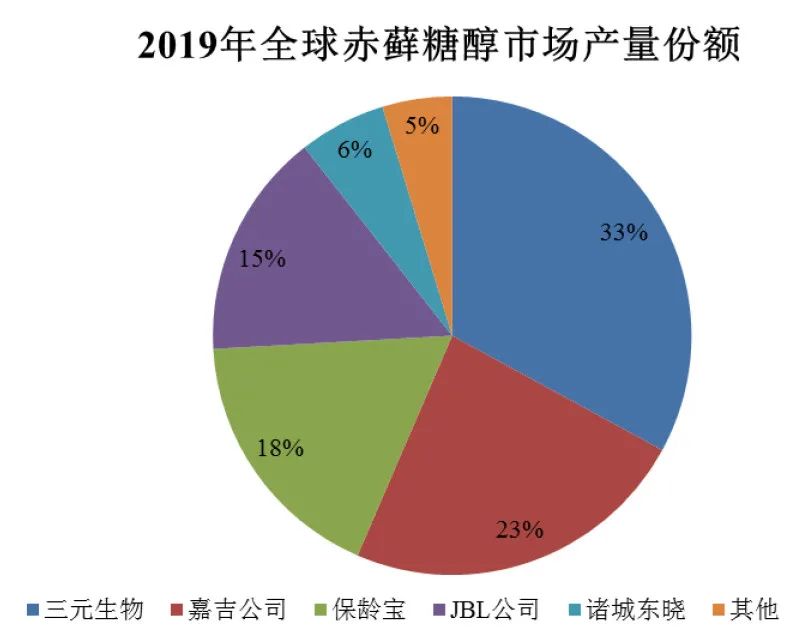 相关行业报告显示,2019年,三元生物赤藓糖醇产量占国内总产量的54.90%,占全球总产量的32.94%,为全球最大的赤藓糖醇生产企业。保龄宝以18%的市场占有率位居全球第三。截至2020年末,三元生物拥有赤藓糖醇产能6万吨。