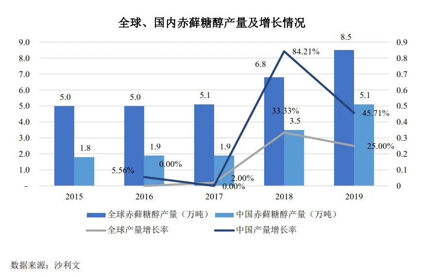 中国赤藓糖醇的消费量于2018年开始,迎来了爆发式增长,当年同比增长近90%,次年再度翻倍。机构预计,2020年-2024年,赤藓糖醇的全球年均增长率仍将高达22.12%。