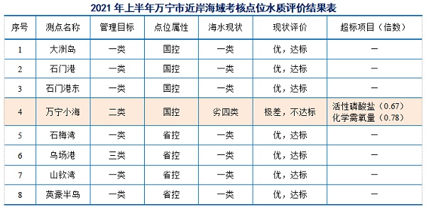 然而,在万宁市生态环境局2021年8月20日公布的《万宁市2021年春季近岸海域 海水环境质量状况》中显示,2021年上半年万宁市近岸海域考核点位水质评价结果中,万宁小海的海水现状依然归为劣四类,现状评价为极差,不达标。在小海养殖区水质状况结果中,2021年上半年,小海养殖区水质总体为差。未能满足养殖区水质目标要求。老爷海两个监测点的水质也都出现了活性磷酸盐超二类标准的情况。