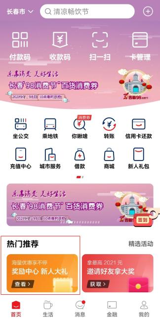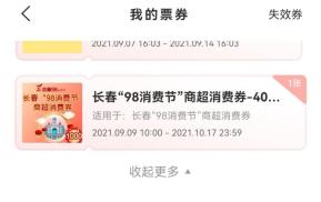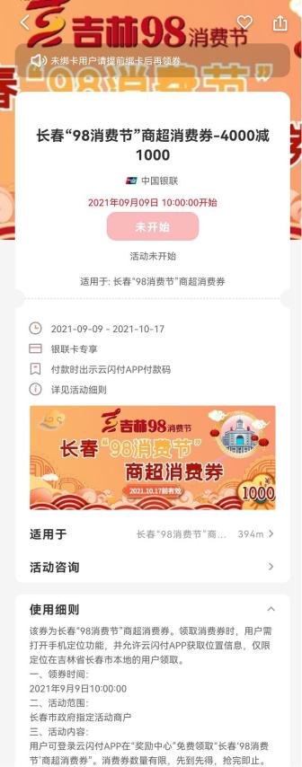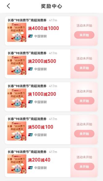 在云闪付APP首页-“热门推荐”-“奖励中心”界面,可看到“长春‘98消费节’商超消费券”相应活动。抢券开始时间为2021年9月9日10:00(领券时,用户需打开手机定位功能并允许云闪付APP获取位置信息,仅限定位在吉林省长春市本地的用户领取)。本次消费券为满减券,活动力度分别为4000减1000、2000减500、1000减200、500减100和200减40,单用户每个力度的票券限领1张,合计仅限领2张,用户成功抢到消费券后会自动存入其账号中。