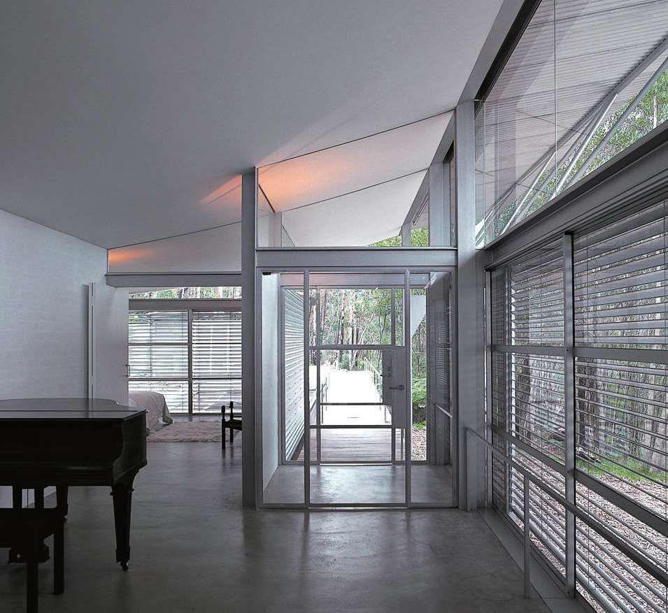 辛普森-李住宅设计图最终的成果,这座住宅仍然像一艘船,但绝不是“军舰”,而是轻巧的快艇。一条窄窄的木板桥,串起一大一小两间独立的屋子。前面的小屋,是车库、洗衣房兼做女主人的陶艺工作室。后面的主体,是宽大的客厅和两间卧室。两座小屋之间,是一片精心设计的水池。几根轻盈的钢柱,支撑着整座建筑,“漂浮”在长满苔藓的岩石上。建筑的外观,几乎完全由钢、铝和玻璃构成。除了波纹铁皮的屋顶、墙面自然形成的线条,没有任何装饰。波纹铁皮优雅的水平线,和周围一棵棵树的竖线条,相互映衬。像树枝一样分叉的钢杆,支撑着飞扬的屋顶。每逢降雨,宝贵的雨水顺着倾斜的单坡屋顶,汇入屋后圆柱形的储水罐,再定期注入水池。镜子一样的水面,把阳光反射到屋里的天花板,再经过一次反射,在室内洒下柔和的自然光。