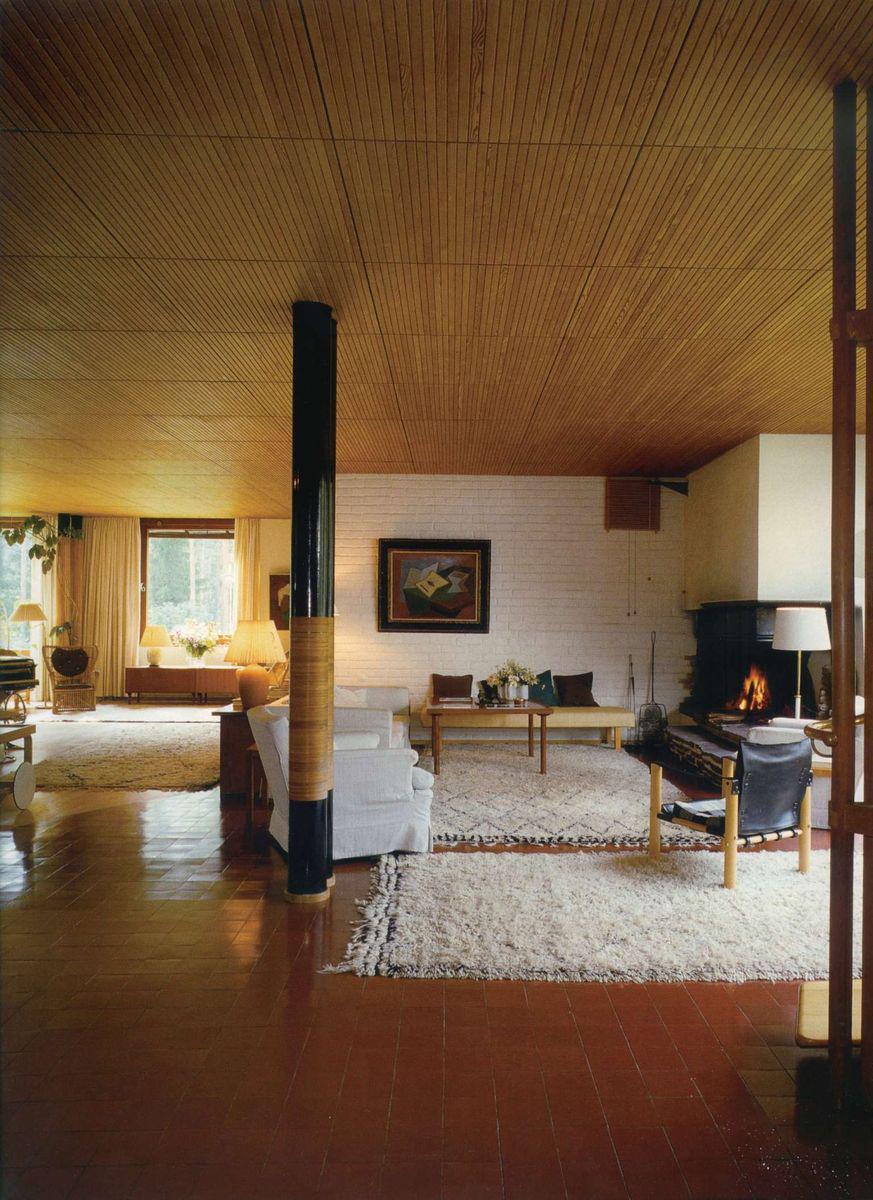 梅丽娅别墅一楼的开敞空间充满了流动感人们谈论梅丽娅别墅的时候,多数会提及它的木护墙,这一木质结构成为别墅的经典符号。由于木材工业的惠顾,阿尔托对木材的价值进行了重新评估,并开始用木材取代混凝土,作为其建筑表现的首选材料。对于自然材质的重新认识,也让建筑师逐渐与流行的国际主义脱离,回归到芬兰本土的民族浪漫主义中来。在后来的实践中,阿尔托认为,从钢筋混凝土转向木材等自然材料,对于他的建筑创作发展是至关重要的。他把这看成一种依靠直觉的设计途径,比通常的线性逻辑更能反映环境。