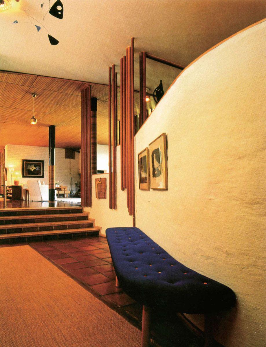 莫卡特设计的许多建筑,入口都刻意设在长条形体量的尽端,辛普森-李住宅在这方面尤其突出。沿着细长的木桥,经过一片形状不规则的小水池,守护着“洞穴”的神灵似乎就住在水中。你站在木桥上,静静地端详小屋在水中的倒影,就是获得了神灵的允许。继续向前,推开玻璃门走进室内,就像结束一天的围猎,回到让自己安心的山洞。这里就像山洞一样,给人安详的庇护,只不过比所有的山洞更明亮、更舒适。梅丽娅别墅