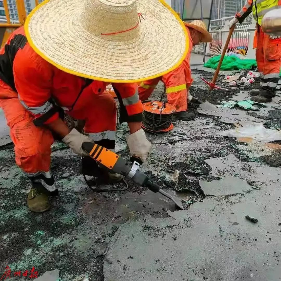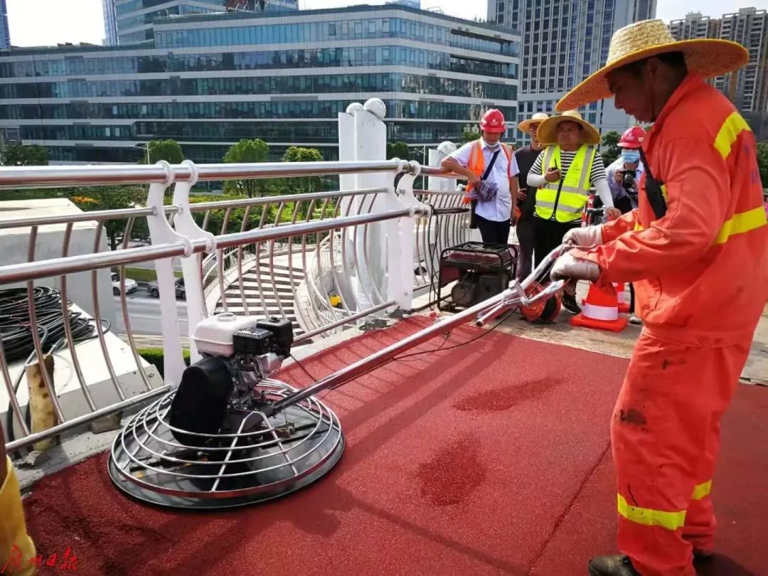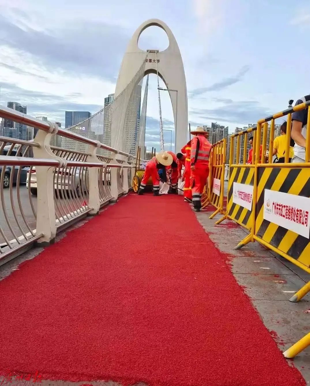 人行道施工方、广州市市政工程维修处有限公司相关负责人表示,猎德大桥人行道部分路面从建桥开始就没有修补过,长时间风吹雨打、日晒雨淋,路面磨损情况严重。如今使用的新材料,更加轻薄、耐磨、防水、抗滑,具有常温施工、交通诱导、警示等功能,施工3~8小时后就可开放通行。