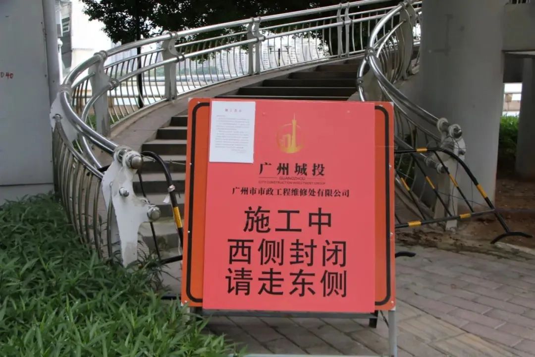 人行道入口处的《施工告示》提到,由于猎德大桥景观照明灯具老化,照明品质有所下降,为彻底提升一江两岸桥梁景观照明整体形象,统一视觉语言,打造高品质滨水夜景空间,提升珠江夜游品质,从7月11日起至9月30日,对猎德大桥进行景观照明提升施工。