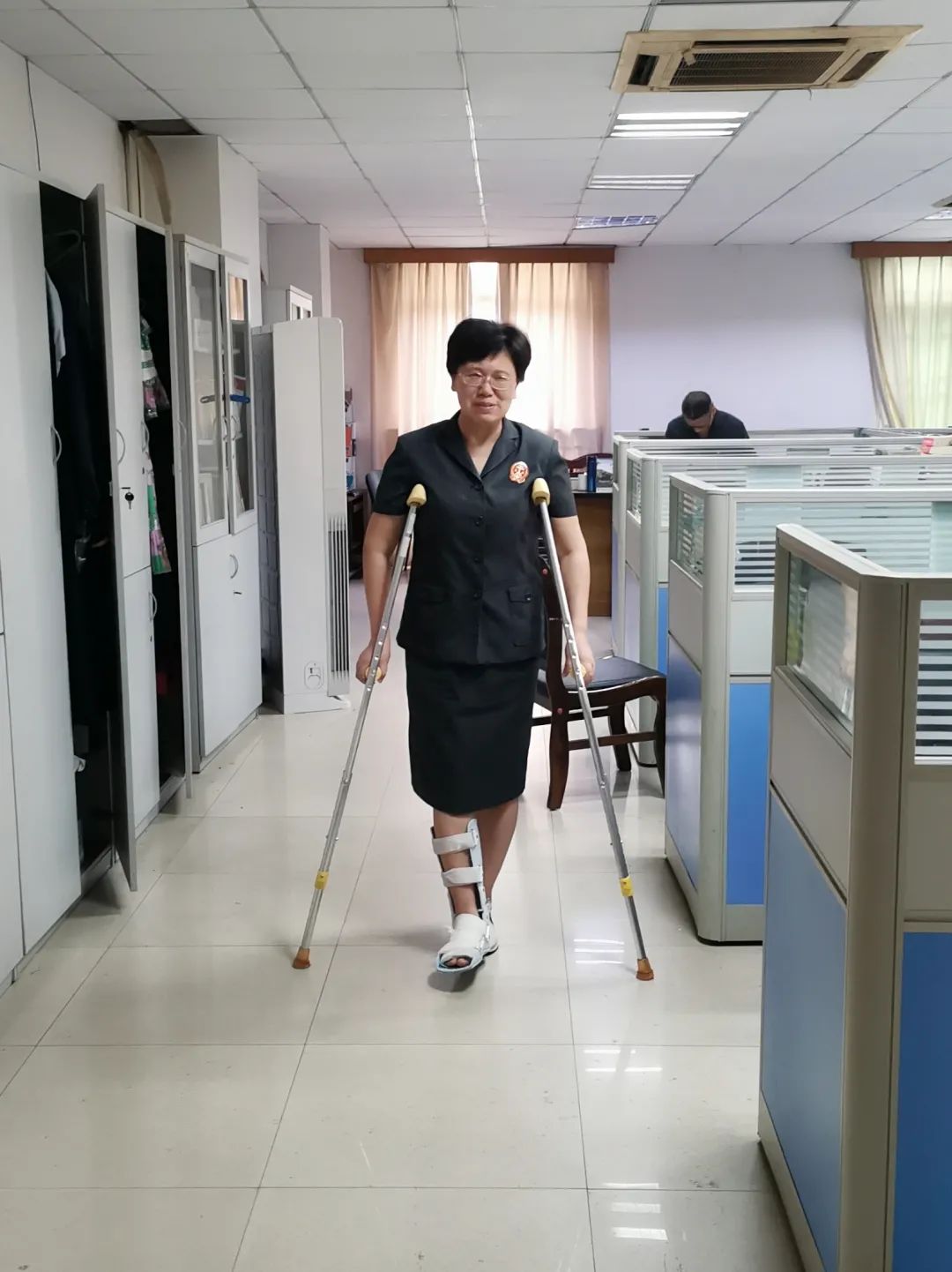不久前,宋阳龄同志意外摔伤,造成右腿粉碎性骨折,做完手术后,医生建议至少在家卧床修养两个月,等恢复好了才能上班。但半个月不到,她便又来到工作岗位,准备开庭。身边的同事劝她可以把事情交给其他人,等伤好了再安心工作,但她说:“这些案子一直是我负责,我比较清楚,而且大家都非常忙,没事的,这点伤不算什么。”于是,便认真投入工作中。