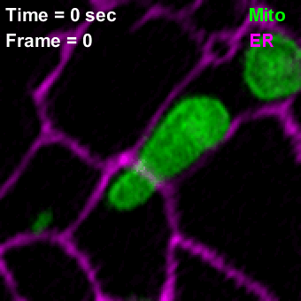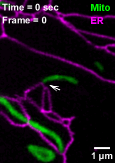 线粒体(绿色)在与内质网(紫红色)接的触位点分裂那是生物课本上没来得及更新的 “爱恨情仇”:短棒状或圆球状的线粒体们正 “扭来扭去”。仔细观察,它们 “扭动” 的频率并不相同,因为内质网与线粒体接触点更能够促进线粒体的分裂与融合。而运动着的溶酶体仿佛行走的 “剪刀”,所到之处,可以带来管状内质网的瞬时断裂……