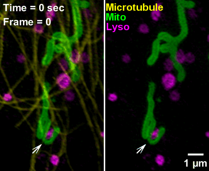 他研究的掠入射结构光超分辨显微镜技术(GI-SIM),刷新了自己在博士后期间的TIRF-SIM能达到的效果。可以在97纳米分辨率下,以每秒成像660幅的速度连续成像,“照见”细胞1微米深度内的动态。通过这一技术,你能看到细胞器和细胞骨架进行着高度动态又有组织的相互作用,细胞器之间也进行着蛋白质和脂类的交换、信号的传递,运动纤毛内繁忙的 “交通”,等等。