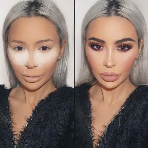 黑眼圈、眼袋、法令纹如果比较明显的话,在化妆时要多花点心思弱化它们。但是也不要用力过猛,因为产品用量越大,越容易厚重不自然,也更可能斑驳卡纹。上图这种眼下遮瑕提亮术,在现实中就太过刻意,还挺不好看的。人的脸型也会和年龄感挂钩。年轻的脸更饱满,而骨感明显,太阳穴、脸颊、眼眶凹陷感比较强的话,就会给人感觉更成熟。因此,欧美风格强调骨骼感的修容是会显老的。