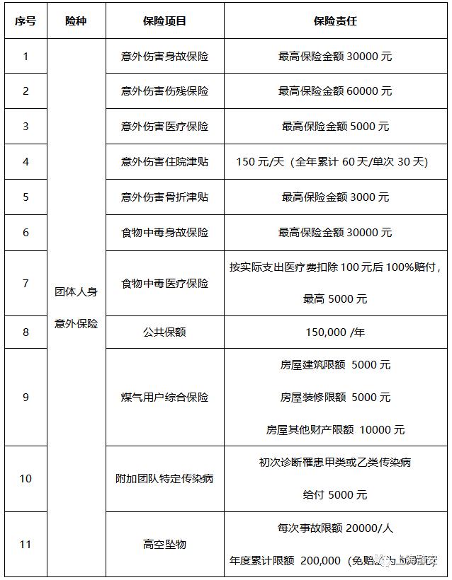 保险项目有意外伤害身故、意外伤害伤残、意外伤害医疗、意外伤害住院津贴、意外伤害骨折、食物中毒身故、食物中毒医疗、煤气用户综合保险、附加团队特定传染病以及高空坠物,并设立公共保额。
