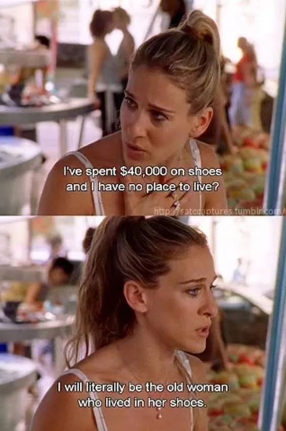 Carrie把高跟鞋比作爱人,还为此爆出过不少金句,比如“$40,000 on shoes alone, but had nowhere to live.(光买鞋就花了4万美金,但却无家可归。)”,还有最知名的那句,“站在高跟鞋上,我可以看到全世界。爱情会逝去,但鞋子永远都在。”
