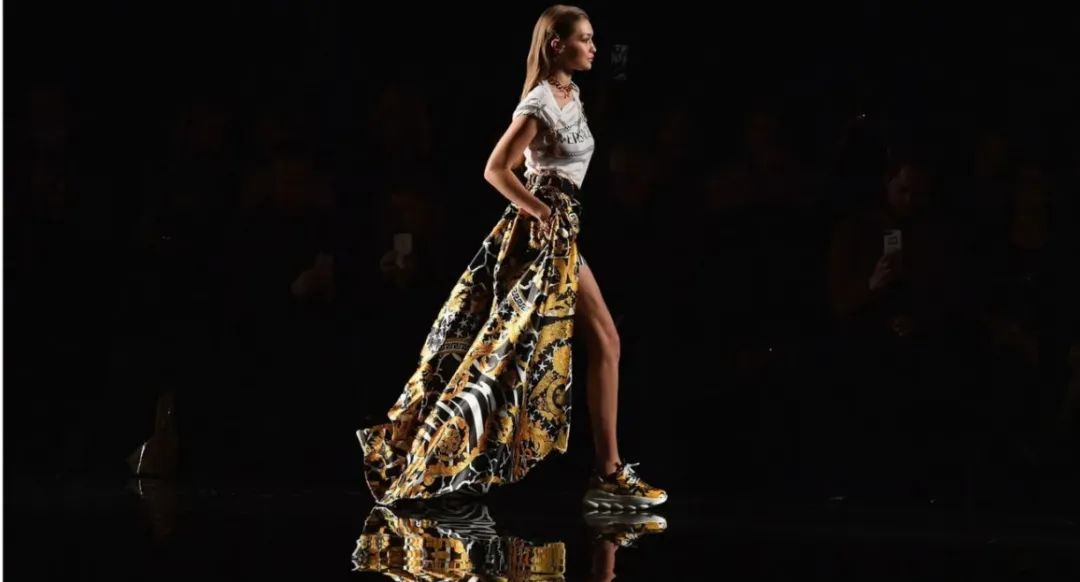 2019年,Gigi Hadid穿着运动鞋走了Versace大秀(图源:getty images)为了讨好越来越不喜欢穿高跟鞋的女性客户们,即便是Jimmy Choo也得做出改变。