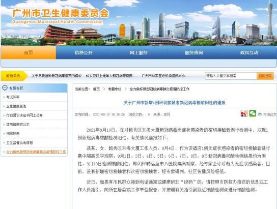 9月10日下午,广州市卫生健康委网站发布《关于广州市新增1例密切接触者新冠病毒核酸阳性的通报》:2021年9月10日,在对越秀区东海大厦新冠病毒无症状感染者的密切接触者例行检测中,发现1例新冠病毒核酸检测阳性。