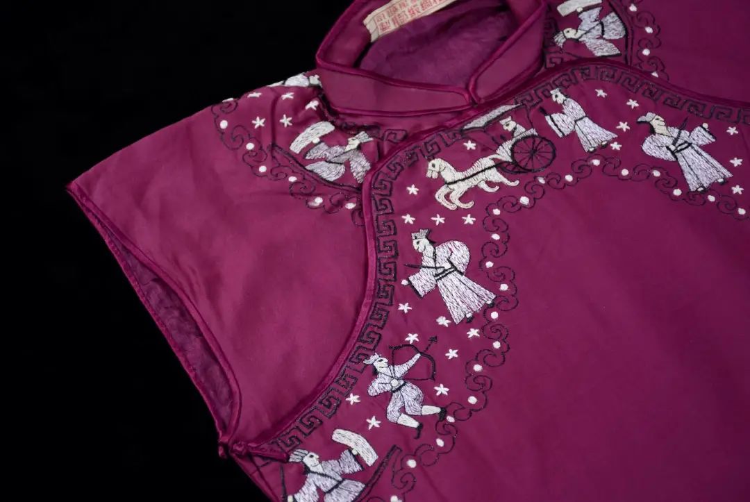1940年代初期汉代车马人物刺绣双襟旗袍,民国时的汉墓考古成果被体现在时装上,让战争时期的“古风”服饰多了点现代的卡通感,廉子雎收藏但我不觉得了解传统审美,就一定代表要在现代的服装设计中照搬。曾经的时装是在畅想未来的,反倒现在的时尚却常常陷入模仿过去的泥淖。我们有时会被古人的智慧与创新打动,就是这种单纯的欣赏,不也挺好的吗。