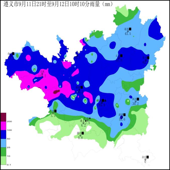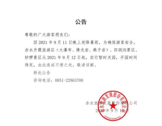 ▲9月11日21时~12日10时10分全市雨量分布图今天,赤水旅游公众号发布了《关于赤水丹霞旅游区、四洞沟景区、桫椤景区临时关园公告》,具体公告如下: