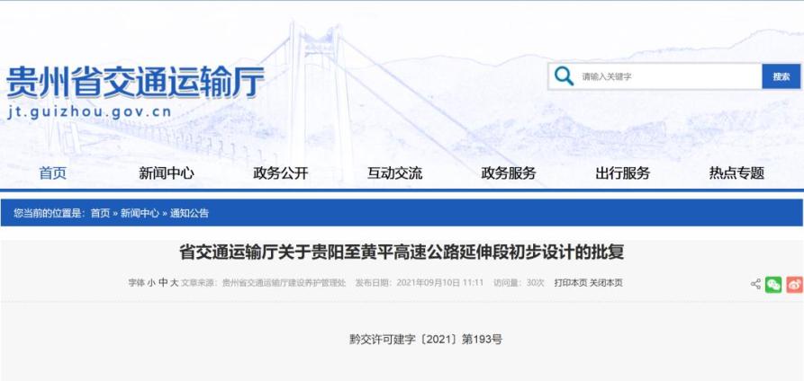 贵州省交通运输厅关于贵阳至黄平高速公路延伸段初步设计