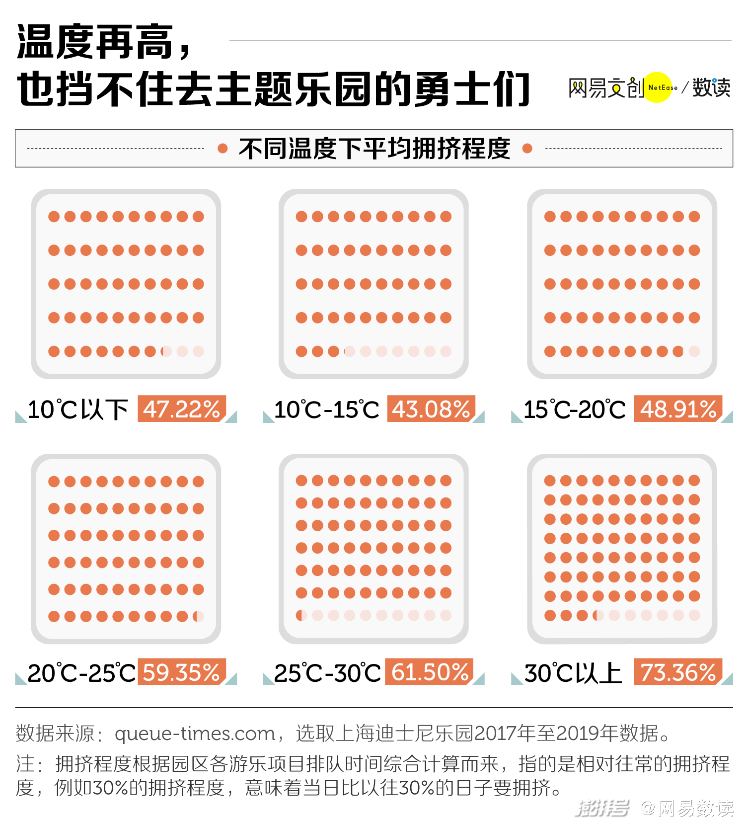 当日平均气温在 30℃ 以上时,上海迪士尼乐园反而到了人最多的时候,拥挤程度要比平均水平高出 30% 以上。