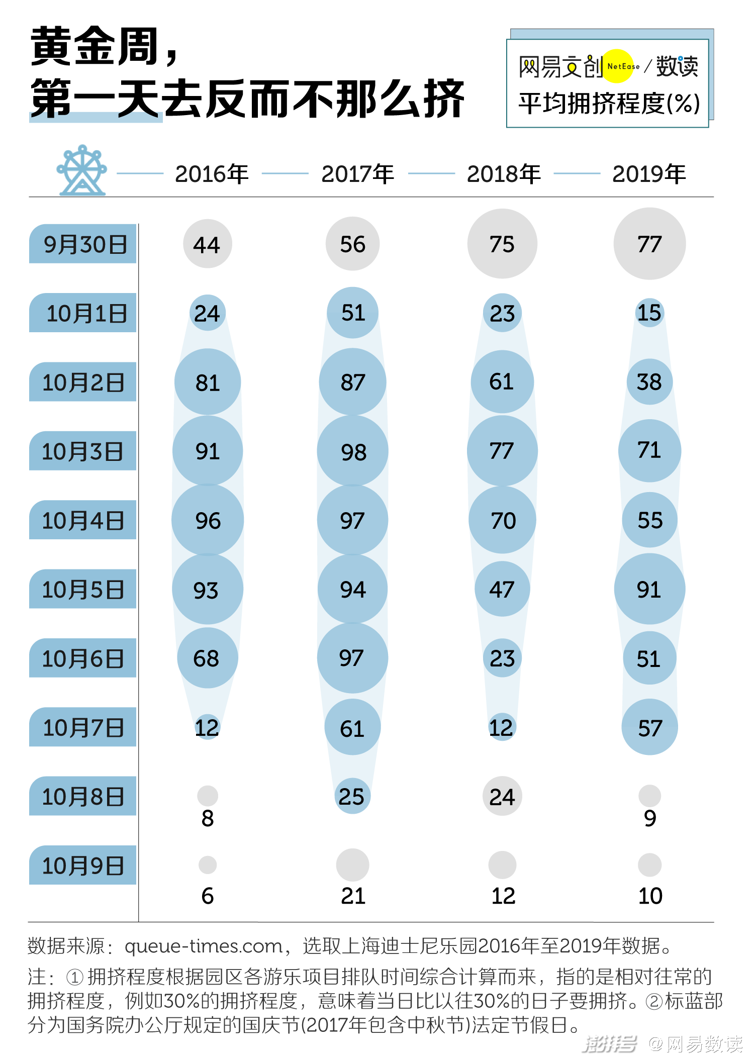 我们以上海迪士尼为参考样本,查阅 Queue Times 网站整理的历年上海迪士尼乐园每日拥挤程度数据,获取到主题乐园的排队秘诀。