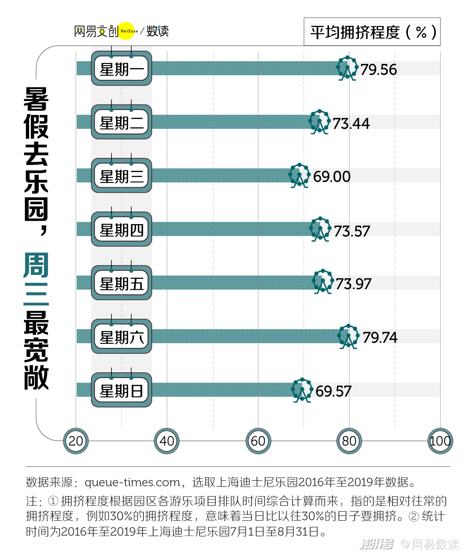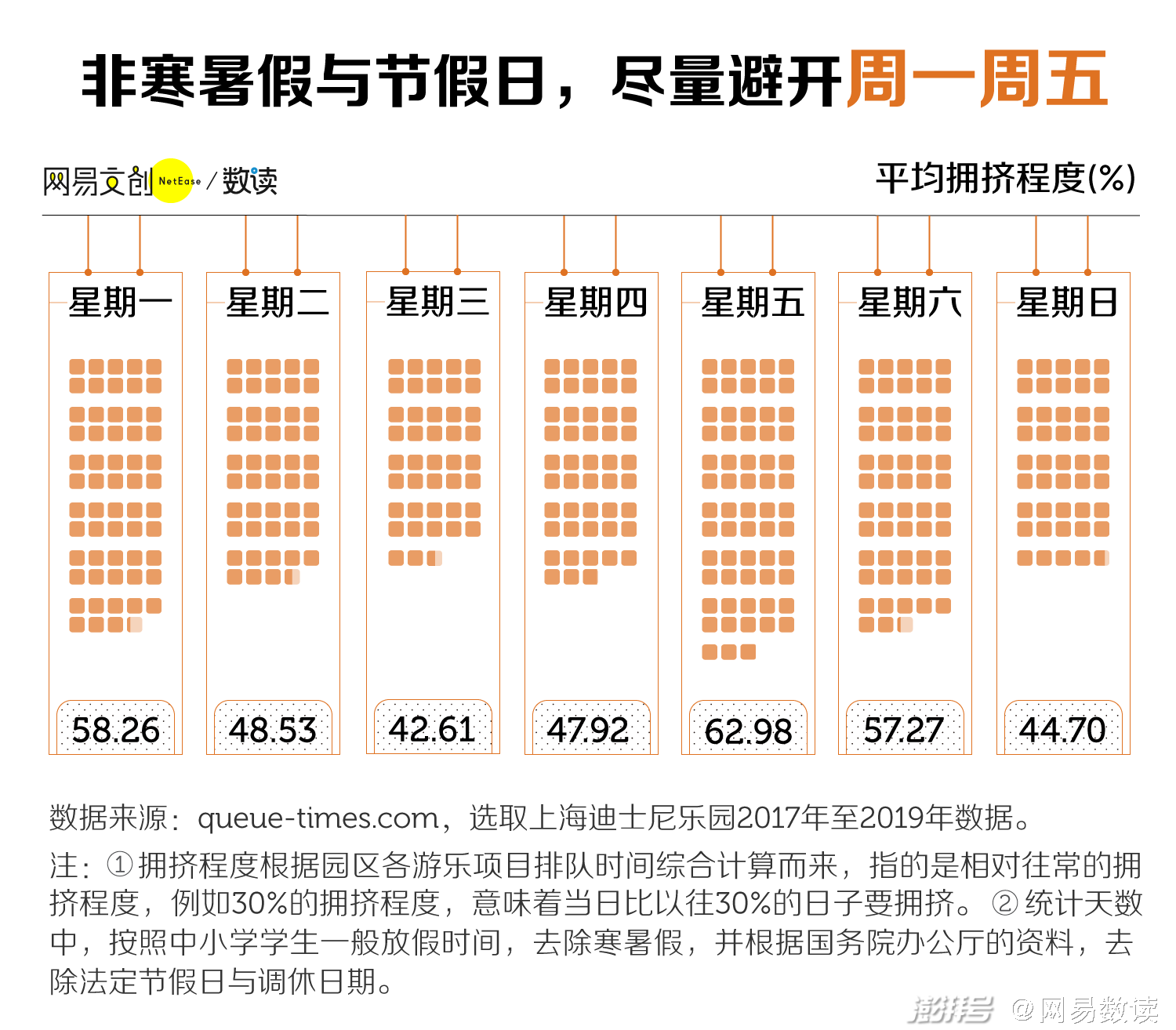 当然,很多在学期中的学生,无论工作日还是周末,都被成山的课业占据,他们中的很多人只能选择炎热、拥挤的暑假前往。我们发现,哪怕你选择暑假去主题乐园,周三依旧是个好选择,拥挤程度比其他日子略低一筹。