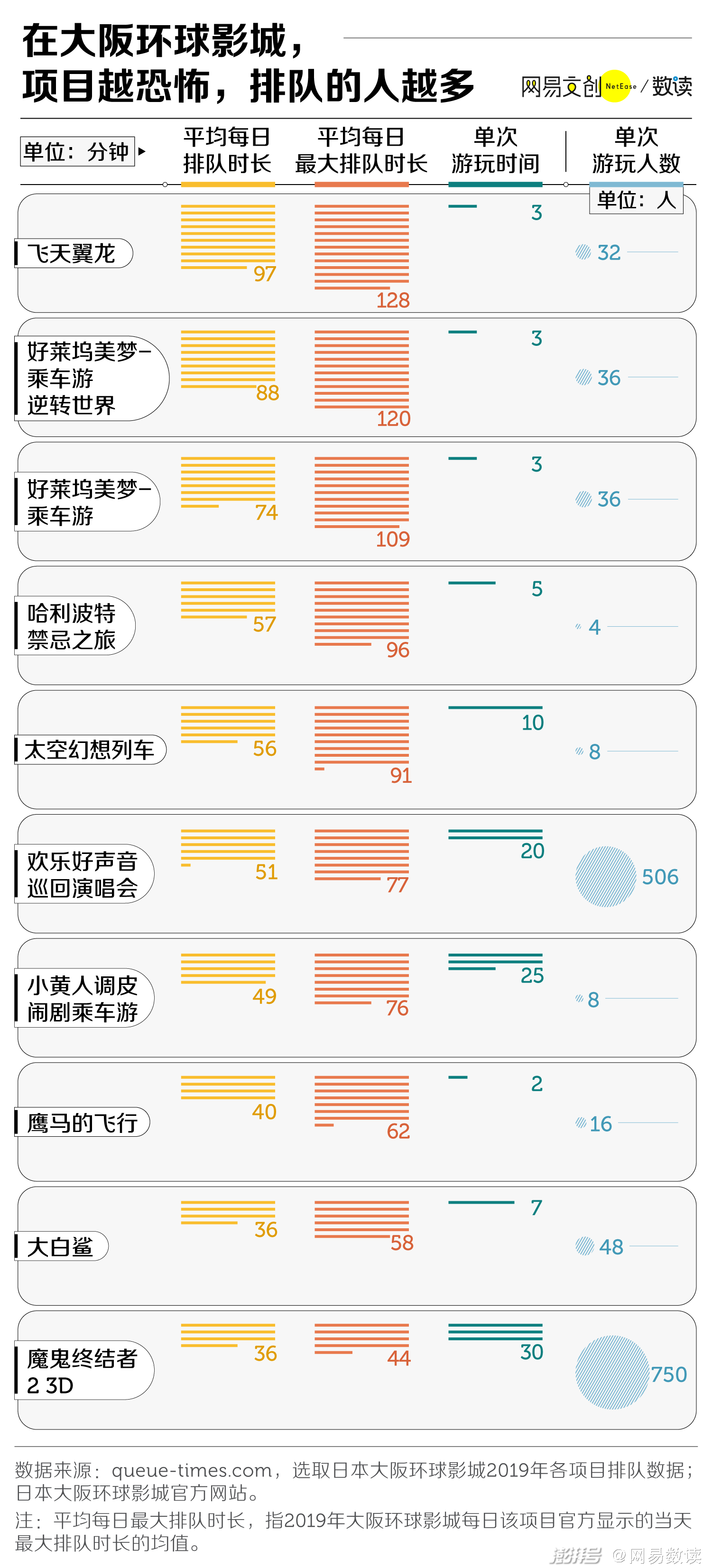 我们以同在东亚、文化相对更相近的日本大阪环球影城为分析对象进行分析,从常驻游乐项目排队情况来看,项目越恐怖,人们越趋之若鹜。