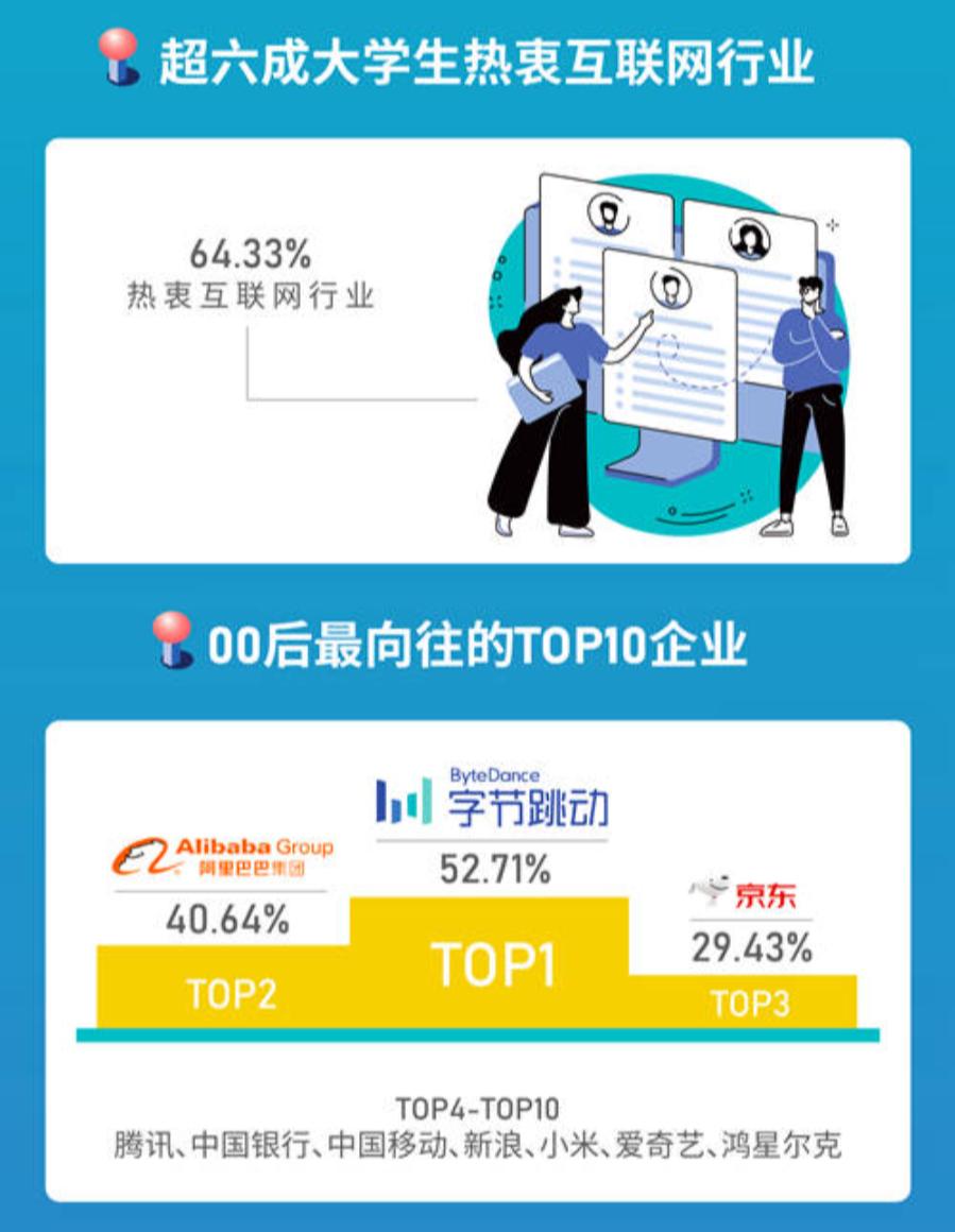 秋招季来临,第一批00后即将加入求职队伍。中国青年报·中青校媒面向全国各地大学生发起关于就业的调查,回收2700份问卷调查结果显示,在各个行业中,互联网行业最受欢迎,64.33%大学生希望毕业后能进入互联网行业工作,其中近八成工科生将其作为自己的求职目标。此外,文体产业(42.55%)和教育行业(40.59%)仅次于互联网行业,分别排在最受欢迎行业的第二三位。针对大学生对企业的好感度的调查结果显示,受访00后大学生最向往的企业前三名分别是字节跳动、阿里巴巴和京东。