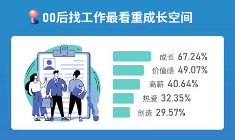 调查显示,对于00后而言,工作不是单纯的“饭碗”,这届年轻人把工作当成展示、发挥的舞台,比起赚钱,他们更在意成长空间和个人在工作中的价值体现。在受访大学生首次求职最看重的工作属性中,成长、个人能力提升快(67.24%)排在首位。价值感、让人感受到工作的意义(49.07%),高薪、满足物质基础(40.64%),热爱、在自己喜欢的领域闪光(32.35%),创造、能完成从0到1的突破(29.57%)等,也都是00后在求职中所看重的。