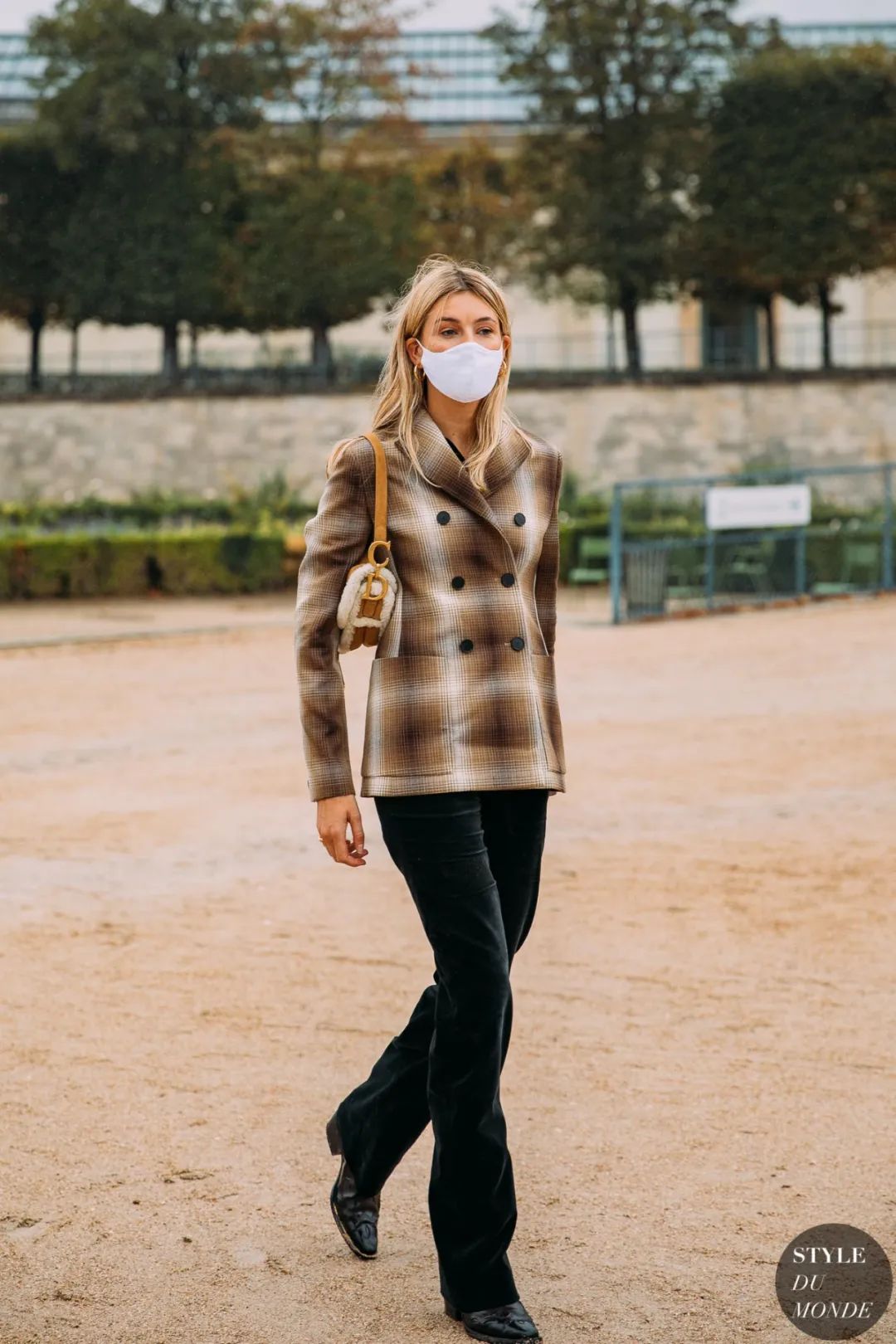 双排扣修身款大格纹西装配合丝绒裤,有一种从容的贵气感。