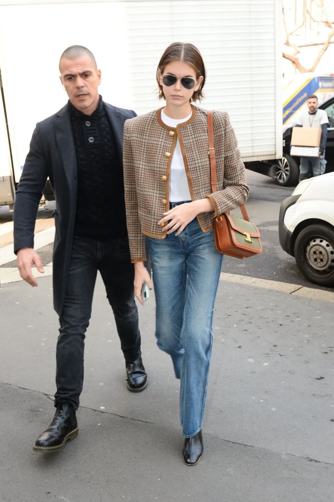 黑白粗花呢外套搭配白色牛仔裤,温柔又大方。