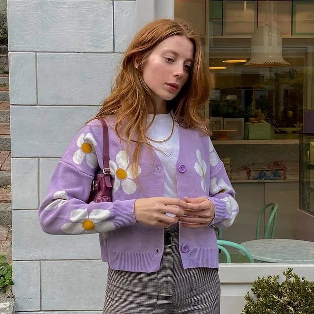 香芋紫针织开衫搭配同色阔腿裤,穿出了一种套装的感觉,不经意间流露出高级感。